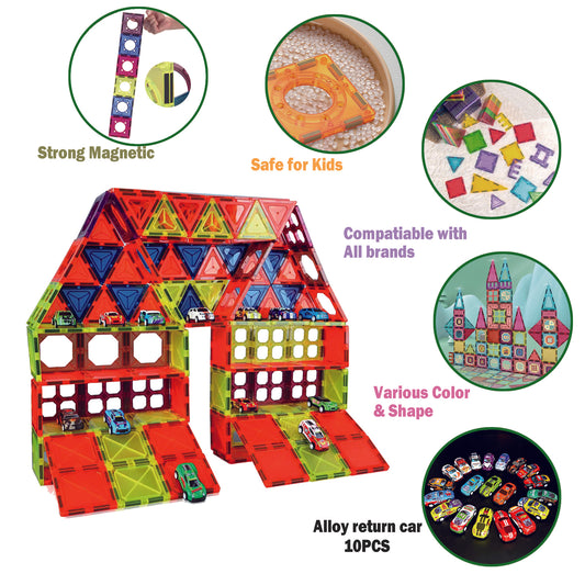 Magnetic Tiles Parking Building Playset with 10 Pull-Back Metal Cars for Kids