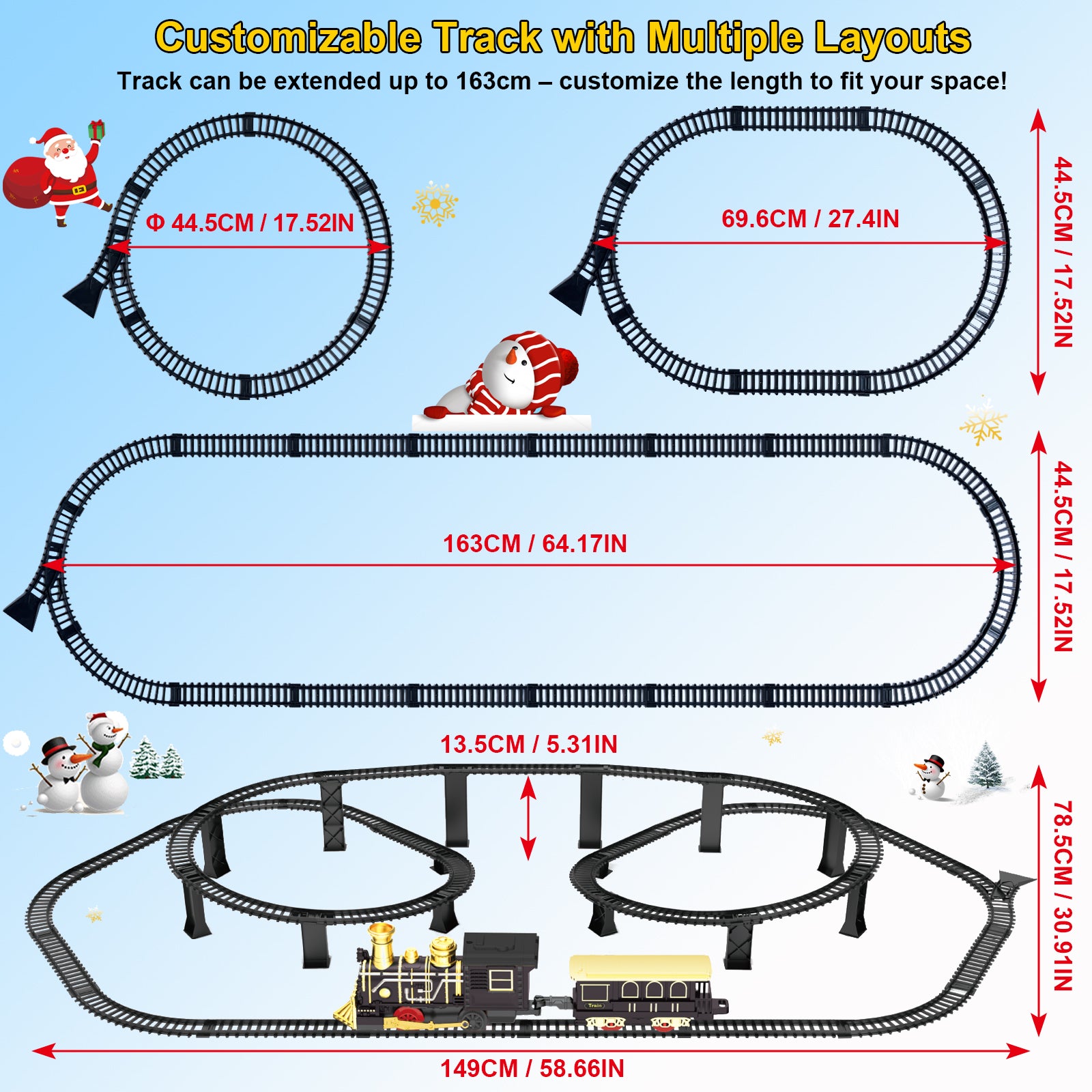 - 🚂🎄【Unique 3D Elevated Track Design – Build Up, Not Just Around!】Unlike ordinary train sets, our Christmas train features a three-dimensional track system with raised platforms, creating a dynamic and visually stunning layout that winds around Christmas trees and gift boxes. Take your Christmas train to the next level—literally! Featuring a 3D spiral and elevated track layout, this train loops around gift boxes and the Christmas tree for a mesmerizing holiday display that’s anything but flat.